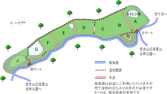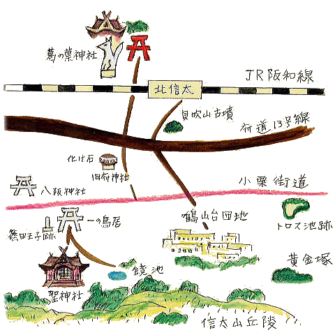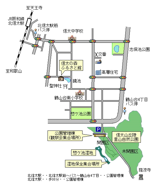 信太の森(信太山)は、和泉市の北東部に位置し大阪の中心部より、JR阪和線で約30分のところにあり、300haもの丘陵地帯が続いています。明治まで、丘陵の大部分は、聖神社の境内地でしたが明治時代のはじめより官有地として陸軍の演習場として管理されてきました。 戦後は自衛隊の演習場として丘陵のほとんどが利用されてきました。 そのためもあって、乱開発からまぬがれ、自然環境が比較的良好に守られてきました。 野鳥・昆虫・植物など貴重な自然が残されています。
