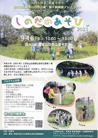 2023 | 2023.9.16 信太山丘陵里山自然公園 第1回開園プレイベント「しのだのあそび」を開催しました ![]() |